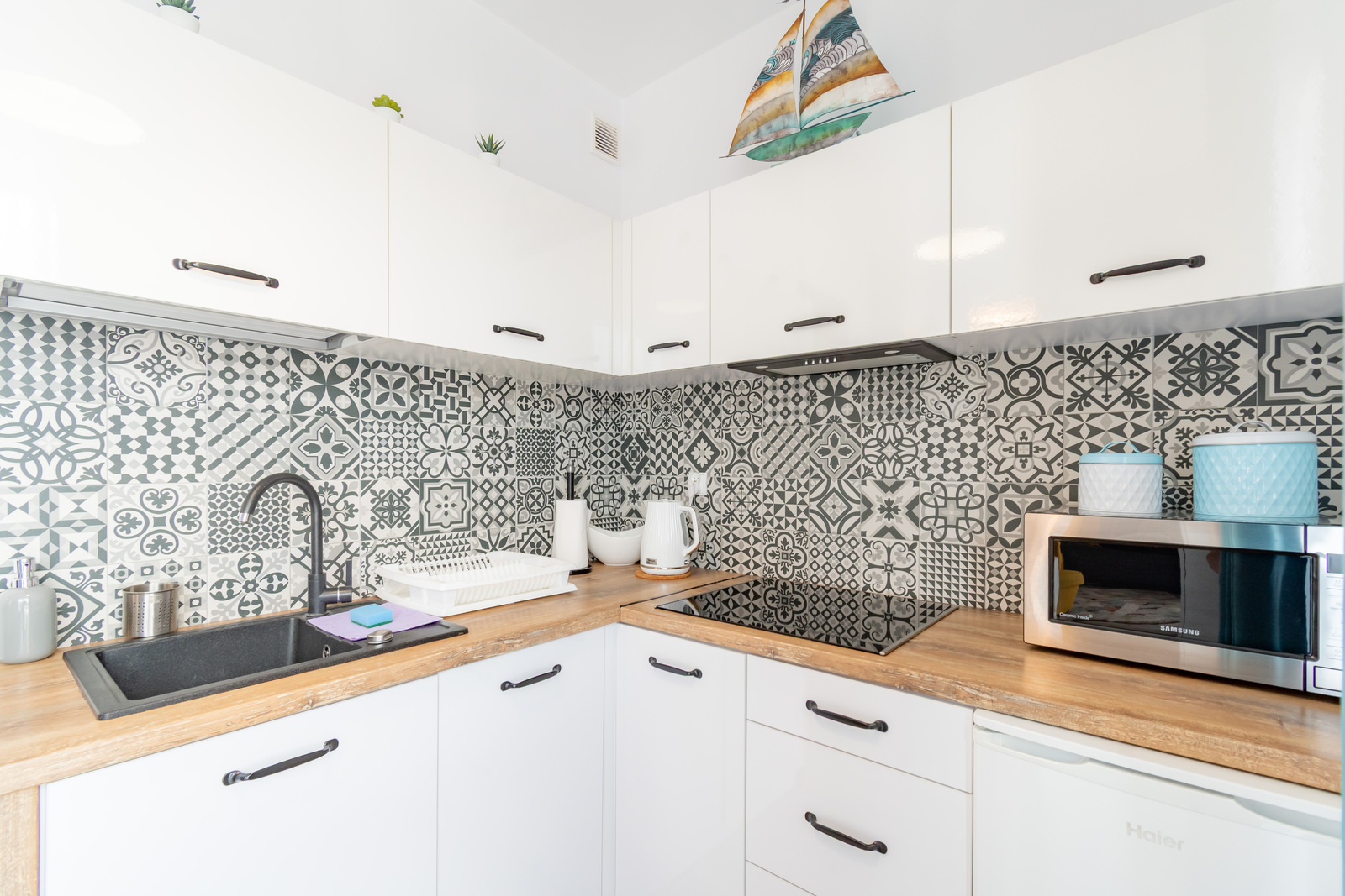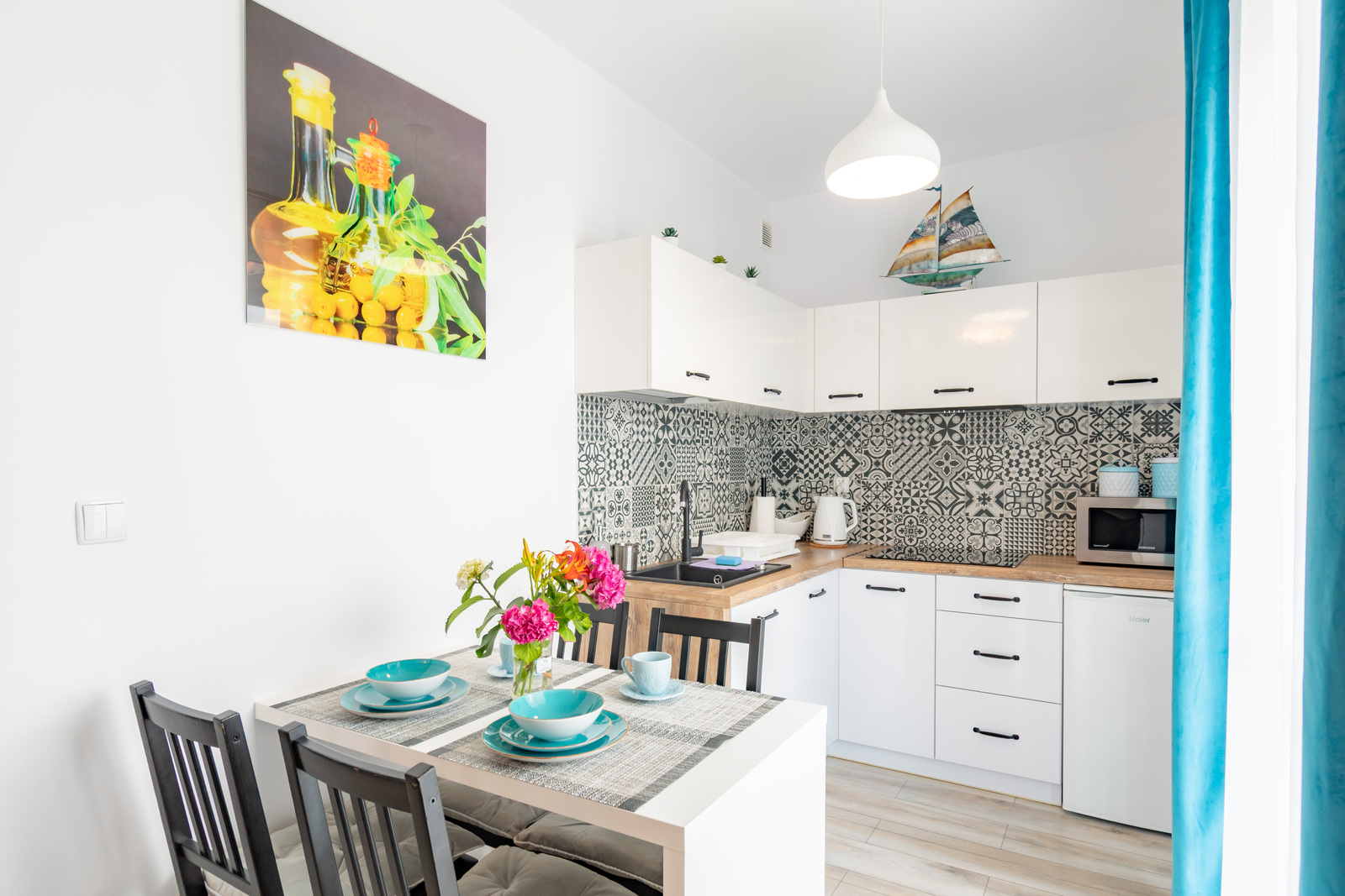 Kuchnia: płyta indukcyjna dwupalnikowa, czajnik elektryczny, kuchenka mikrofalowa, lodówka z zamrażalnikiem, zastawa stołowa, garnki, sztućce, patelnia, deski do krojenia, środki czystości, stół z krzesłami do spożywania posiłków.