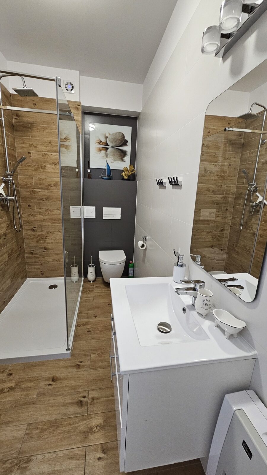 Łazienka: prysznic wraz z deszczownicą, ręczniki, suszarka do włosów.