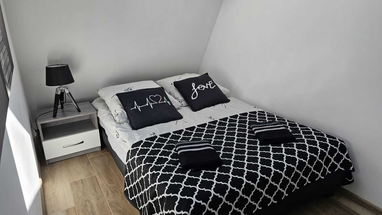 Do dyspozycji gości oddajemy przestronny apartament z dużą, rozkładaną sofą z funkcją spania oraz dwuosobowym łóżkiem małżeńskim. Apartament posiada w pełni wyposażony aneks kuchenny ze stołem do spożywania posiłków oraz łazienkę z prysznicem, w której znajduje się deszczownica i toaleta.